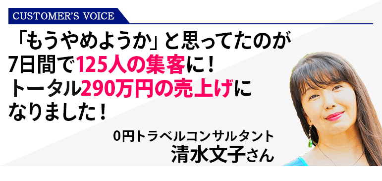 講座に入って高単価商品もでき、「売れる気しかしない」と背中を押してもらって7日間で125名の集客ができました。5回のセミナーが50時間で満席、追加募集も34分で満席になりトータル290万円売り上げることができました。