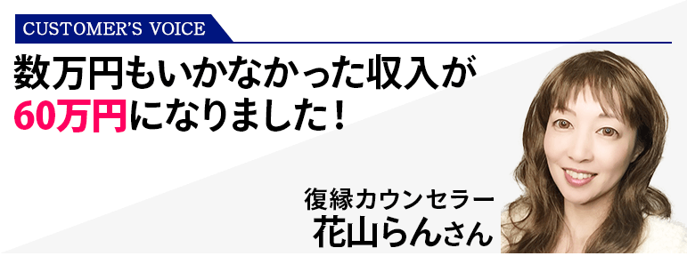 仕組み作り、ビジネスをする上での本質を教えて頂き、数ヶ月で60万円の収入を得られたことには本当に感謝しています。また、深くお客様の人生に関われていることに今とてもやり甲斐を感じています。