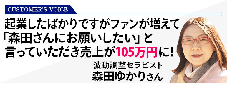 セミナーを見直すことでお客様との信頼関係が深まりファンになってくれる方が増えてきました。その中から「森田さんにお願いしたい」と言っていただけるようになり売上105万円になりました。