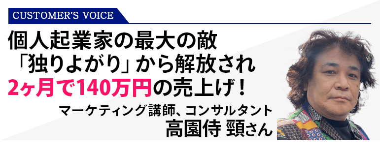 起業当初に陥りがちな孤独感と独りよがりから回避できたのと、セミナーについて同期の仲間にフィードバックをもらって圧倒的によくなりました。売上げも法人向けの研修やコンサルは別にして個人向けだけで2ヶ月で140万円になりまだまだ伸ばせそうです。