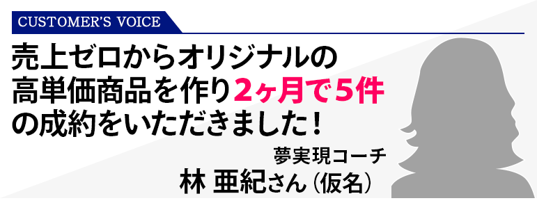 SNSの使い方からセールスの仕方まで、一つずつ、丁寧に教えていただき、3ヶ月で50万1人、30万2人、合計110万円の売上が上がりました。はじめて高単価商品のご成約をいただいたのでとてもうれしい!